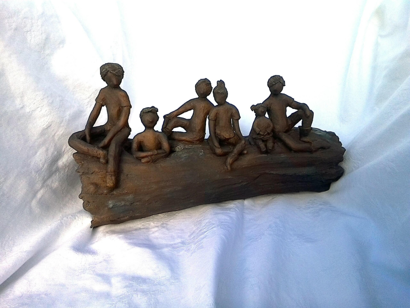 Onze buren hebben 7 kinderen, ik vond het leuk om hier een keramiek werk van te maken, ik heb een grote bol gemaakt en hier alle kinderen in en op verwerkt, 1 meisje leest een boek en alle andere kinderen luisteren, het rechtse meisje zit wat verlegen naast haar grotere broer